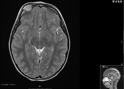 An MRI scan of the orbit, along with a whole-body MRI STIR (to screen for other lytic lesions) were conducted. The MRI demonstrated the soft tissue mass mushrooming through a bony defect with peripheral enhancement, and associated pachymeningeal and leptomeningeal enhancement where the mass bulged against the right frontal lobe (Fig 4). The whole-body STIR showed multiple bilateral abnormalities in the tarsal bones and also the cuboids, which were likely to be bony abnormalities reflecting the patient’s interest in gymnastics.