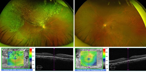 Fig 2. Bilateral, wide-field fundus photographs and macular OCT scans, documenting right superior retinal atrophic and pigmentary changes, extending to the fovea