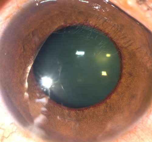 One week later, the right BCVA was still CF and the left 6/6. The IOPs were 13mmHG right eye and 14mmHg left eye. The anterior chamber (AC) was deep and quiet and the NVI/NVA had resolved. The patient was asked to continue on his current treatment and closely monitored over the following weeks.