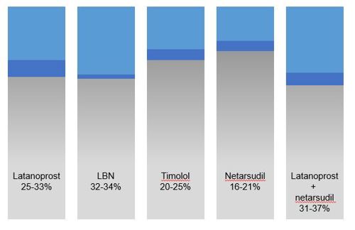 The first clinical trial of netarsudil in patients with raised IOP showed slight inferiority to latanoprost (baseline around 25.6mmHg, netarsudil reduction -5.7mmHg, latanoprost -6.8 mmHg). Three Rocket trials with similar methods all showed that netarsudil 200μg/ml had similar efficacy to timolol 0.5% twice-daily: both medications reducing baseline pressures from around 21.5mmHg to around 17.0mmHg in each trial (reductions of 15-22% with netarsudil 17-22% with timolol)⁵. So, we could summarise that it works as well as timolol.