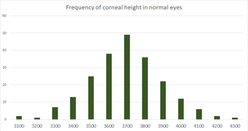It is important to appreciate that there is considerable variation in shape and size of a normal eye. With the corneoscleral topographers that are now available such as the SMap and the Eye Surface Profiler, plus anterior OCT topographers, these ranges can be better understood. Several studies have shown that the average sagittal height of the cornea is around 3750 microns when measured at a 15mm chord. However, the spread of these measurements in normal eyes can vary 600 microns either side of this mean (Fig 1.).