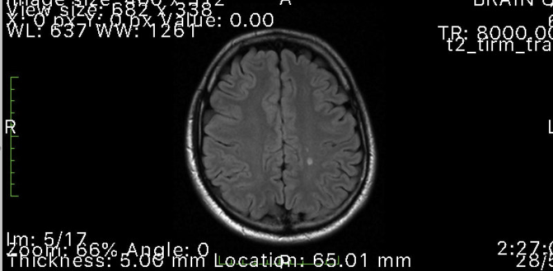 Fig 2. MRI scan showing demyelinating lesions typical of MS
