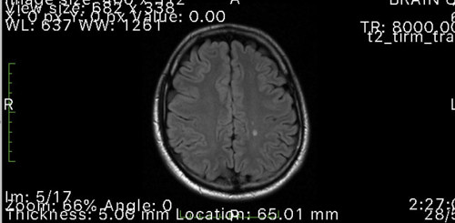Fig 2. MRI scan showing demyelinating lesions typical of MS