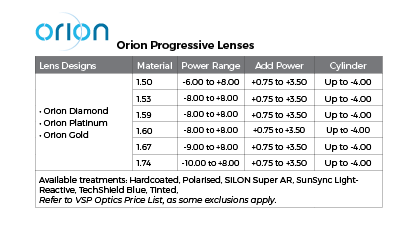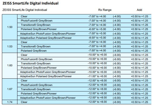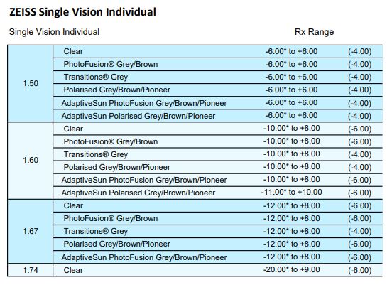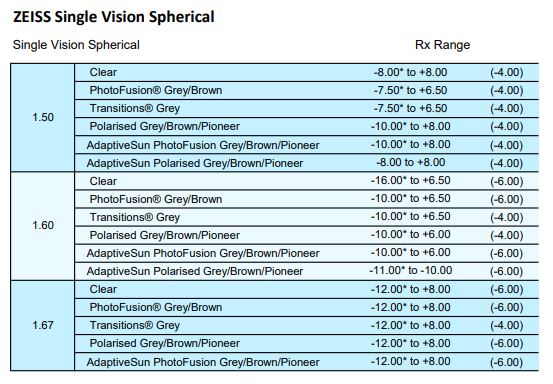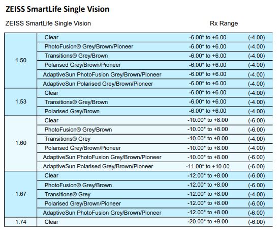 • SFSV 1.50, 1.53 Trilogy Spherical, 1.53 Trilogy Aspherical, 1.59 Poly, 1.60, 1.60 Spherical HMC & HC, 1.60 Aspherical HMC, 1.67, 1.67 Aspherical HMC, 1.74