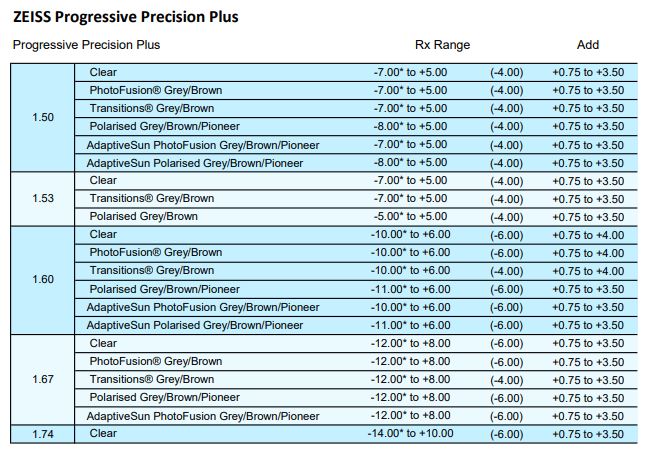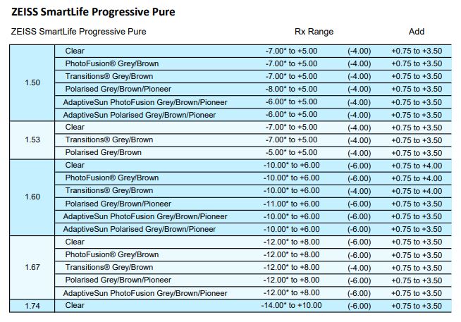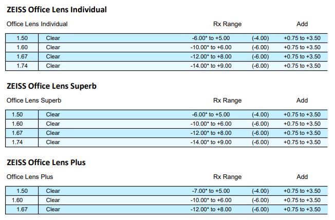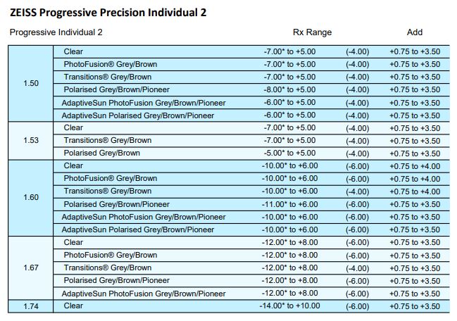 • Clear 1.50, 1.53 Trilogy, 1.59 Poly, 1.6, 1.67, 1.74