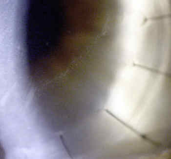 Fig 2. Early endothelial rejection with multiple fine infero-temporal cellular deposits, coalescing into an early diagonal immune line, with very early stromal but no epithelial oedema