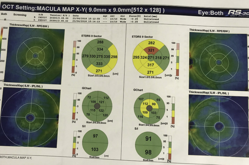 After doing a red cap test and noting the desaturation in the left eye, I directed the 5th year student to do macular OCT scans on both eyes, with the results showing retinal nerve fibre layer thinning, as well as the ganglion cell thinning in the ganglion cell analysis (GCA) for the left eye. Family history, pupils and optic nerve head appearance were all unremarkable, but based on the OCT findings I sent him to his GP to get an MRI scan and neurological work-up as I had recently written an article on multiple sclerosis (MS) and the eye.
