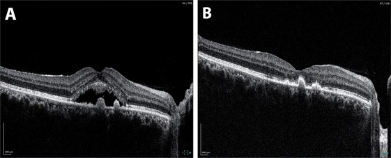 Fig 2. A. At baseline, OCT through the right fovea demonstrates subretinal fluid with small hyper-reflective pigment epithelial detachments. B. Following laser, there has been complete resolution of subretinal fluid at the fovea.
