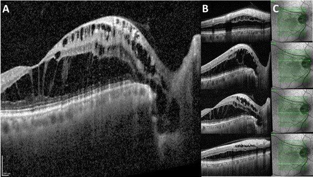 A 58-year-old male with no underlying medical history was referred for retinal oedema adjacent to the optic nerve head with cystic changes and a shiny appearance on the overlying retina for the right eye. Unaided visual acuity was 6/9 and 6/6. He was asymptomatic and was incidentally noted to have macula oedema during a routine examination. The anterior segment examination was normal, but the right eye optic disc assessment showed a greyish-white depressed area in the temporal quadrant (Figs 1 and 2) along with cystic changes at the macula. The left eye examination was normal. OCT examination of the right eye showed schisis-like separation of retinal layers, most marked in the outer retinal layers, extending up to the optic disc temporal margins (Fig 3). There appeared to be a clear communication between the optic disc and the schisis-like separation of outer retinal layers.