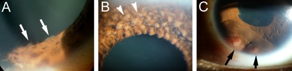 Fig 3. Iris changes associated with systemic diseases. (A) Koeppe nodules found on the pupillary margin (arrows), (B) Bussaca nodules (arrowheads) on the iris anterior border layer, typically in the iris mid-periphery, and (C) iris granulomas (arrows) located close to the angle, associated with sarcoidosis