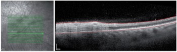 Diagnosis of ARN is clinical, supported by laboratory investigations, but multimodal imaging can aid diagnosis. Ultra-widefield photography can be useful to identify peripheral retinitis in ARN, particularly when the fundal view is obscured by vitritis or the patient is photophobic and difficult to examine. OCT imaging is not always possible through the retinitis as it is frequently too peripheral; when possible, we see hyperreflectivity and thickening of the inner plexiform layer early in presentation, followed by full thickness involvement of all retinal layers (Fig 4)5.