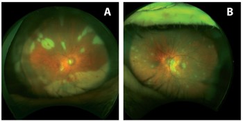 Fig 1. Optos images of right (A) and left fundus (B) in a case of bilateral VZV acute retinal necrosis with vitritis, widespread multifocal retinitis, retinal haemorrhages and optic nerve swelling