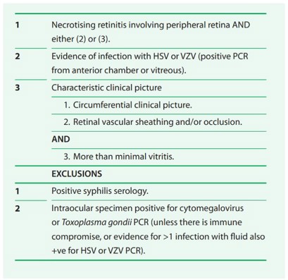 The key clinical features of ARN are panuveitis with retinitis or retinal necrosis and vasculitis. The diagnostic criteria proposed by the Standardisation of Uveitis Nomenclature (SUN) Working Group are summarised in Table 11. Most cases are caused either by varicella or herpes simplex viruses. There are several clues on clinical evaluation to help point towards the diagnosis of an infective retinitis.