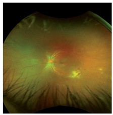 Fig 2. Optos image of left fundus in VZV ARN showing