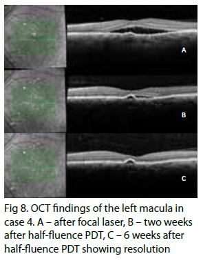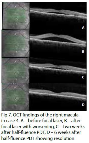 Although there was an improvement in the amount of subretinal fluid three months after his right eye became symptomatic, there was still significant fibrin on the OCT imaging and a fluorescein angiogram showed an ongoing leak. Half-fluence PDT therapy was performed without any complications.