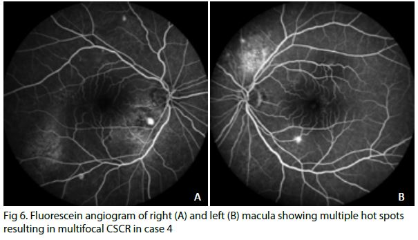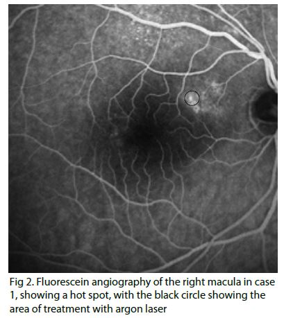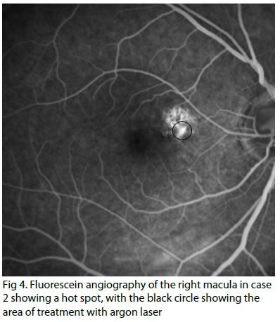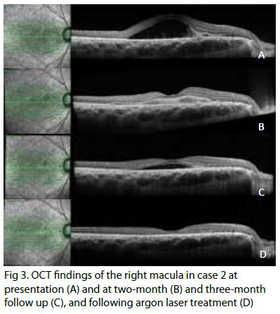 A gentle treatment with argon laser was performed (100mW, 10ms and 100µm). Six weeks after the laser therapy (Fig 3D), the condition has completely resolved, with a visual acuity of 6/9 in the right eye.