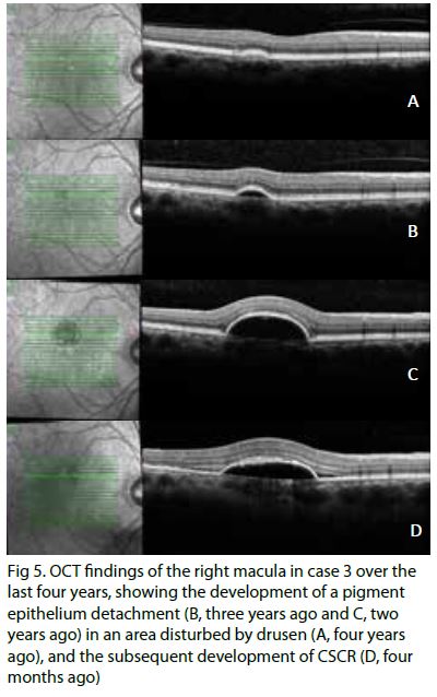 A 65-year-old man who’d noticed vision disturbance in his right eye for the past three months. Previously he had left CSCR which resolved after a prolonged period of observation. His acuity was 6/7.5 right and 6/6 left. Reviewing his previous imaging, there was choroidal thickening which gradually resulted in an enlarging pigment epithelium detachment (PED) in an area of the right macula with mild drusen. The large PED subsequently developed a microbreak with mild deflation, and surrounding fibrin and subretinal fluid when he became symptomatic (Fig 5).