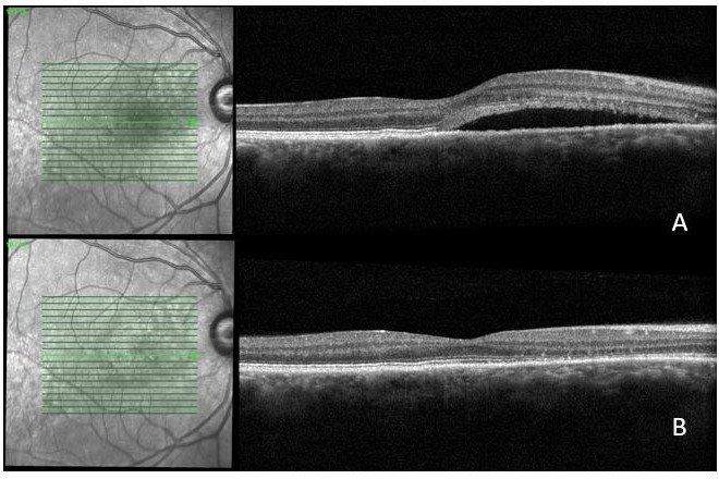 As the hot spot is away from the fovea, a gentle treatment with argon laser was performed (seven shots at 120mW, 10ms and 100μm). The subretinal fluid has completely resolved on his two-month follow up appointment (Fig 1B).