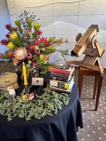 A few of Prof Molteno’s favourite things displayed at his memorial service, including a solar telescope, some of his favourite books and an early version of the Otago photoscreener (centre)